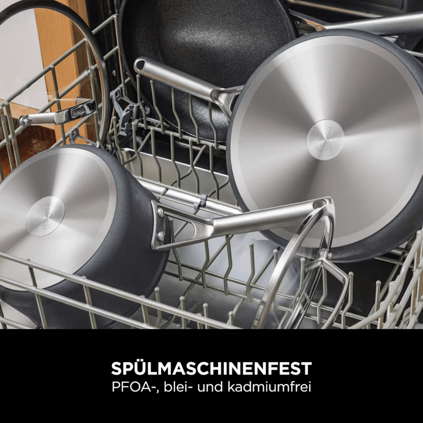 - Chảo làm từ nhôm rèn cứng chắc, phủ lớp anod hóa chống mài mòn.
